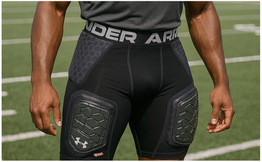 - Men’s football girdle compression shorts with built-in pads for hip, thigh, and tailbone protection.